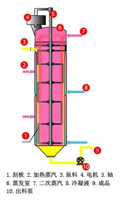 刮板式薄膜蒸發(fā)器由轉(zhuǎn)軸、料液分配盤、刮板、軸承、軸封、蒸發(fā)室和夾套加熱室等所組成,一般有立式、臥式兩種類型。
