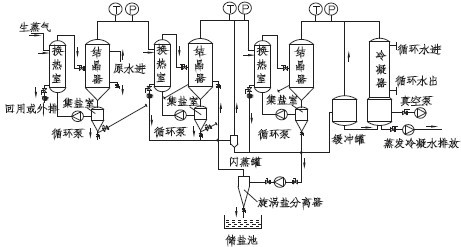 需要蒸發的物料經進料泵進入一效加熱器進行加熱,然后進入蒸發室,進行蒸發,在分離器中進行氣液分離,溶液從分離器底部流入循環泵吸入口,利用循環泵送入加熱器、分離器進行循環流動與蒸發,蒸發出來的蒸汽進入冷凝器被全部冷凝。在蒸發換熱室內,外接蒸汽液化產生汽化潛熱,對廢水進行加熱。由于蒸發換熱室內壓力較大,物料在蒸發換熱室中高于正常液體沸點壓力下加熱至過熱。加熱后的液體進入結晶蒸發室后,物料的壓力迅速下降,導致部分物料水溶液閃蒸或者沸騰。廢水蒸發后的蒸汽進入二效蒸發器作為動力蒸發器進行加熱,未蒸發廢水和鹽分暫存在結晶蒸發室。一效、二效、三效蒸發器之間通過平衡管相通,在負壓所用下,高含鹽廢水或物料由一效向二效、三效依次流動,廢水不斷被蒸發,廢水中鹽的濃度越來越高,當廢水物料中的鹽分超過飽和狀態時,水中鹽分就會不斷地析出,進入蒸發結晶室的下部的集鹽室,整個過程周而復始,實現鹽水分離。